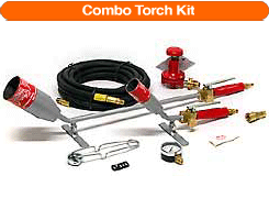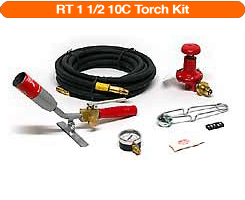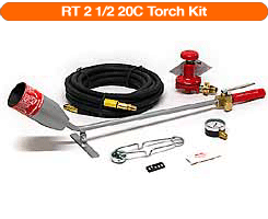 This complete kit includes both a detail and stand-up torch. Equipped with a quick connect fitting that allows the operator to switch from detail to stand-up torch in a snap. No tools are required. Kit includes an RT 11/2 - 10 detail torch with an output of 50,000 b.t.u.’s/hr., RT 21/2 - 20 LW stand-up torch with an output of 400,000 b.t.u.’s/hr., 25 l.p.g. hose, R-567.C regulator, P-W 795 hand tightened p.o.l. fitting, 2 each V-880 squeeze valve, G-23 gauge, 2 each TB- 4 torch stand, L2001 spark lighter and flints, HK 7 quick connector set and a pipe thread sealant.