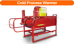 solely for the purpose of heating cold applied products including high viscosity materials such as cutbacks (mastics). Tubes and coil are submerged in 40 gallons of high quality #46 grade heat transfer oil (oil sold separately). Cold process materials and oil are quickly heated by an automatic l.p.g. burner. Hot oil gently warms the material as it is pumped from the barrel through the coils to the roof. Normal working temperatures of 70° - 80° F are easy to maintain with 8-10 g.p.m. material delivery at the pole gun. Warmer is insulated for heat retention. Available skid mounted or trailer mounted. Material manufacturers highly recommend the use of material warmers, even during the hot summer months, to ensure an even continuous flow of material. Promotes longer pump life too.